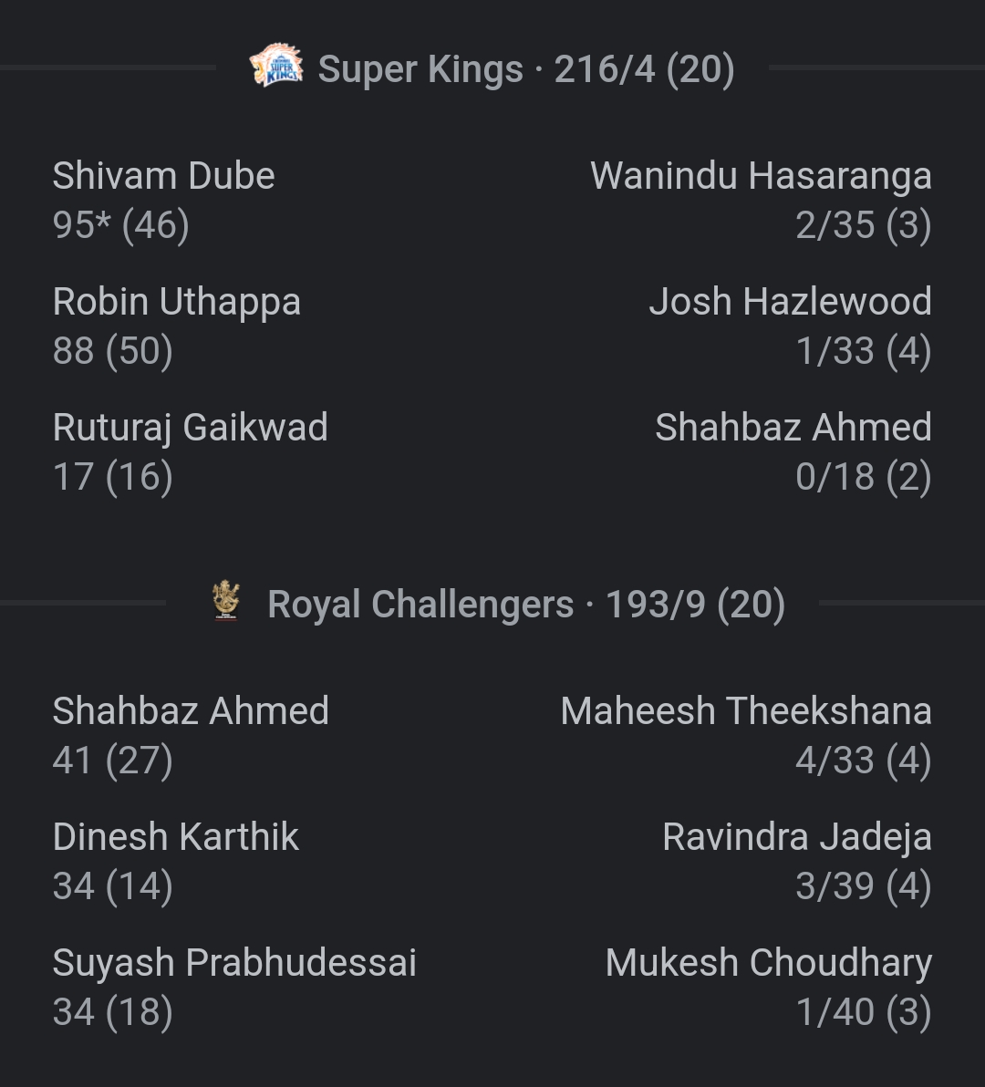 After 2nd innings: With the strong batting line-up, RCB were unable to chase the target of 217 runs against CSK bowlers. The bowling department was too good like the batting of CSK and they won the match by 23 runs. RCB batters were scoring good runs but are getting out too soon and lost 9 wickets in which 4 wickets were taken by Maheesh Theekshana. Captain Ravindra Jadeja also took 3 wickets and both Bravo and Mukesh took 1 wicket each. At last, CSK won their first match in this season and will looking forward to win more matches.